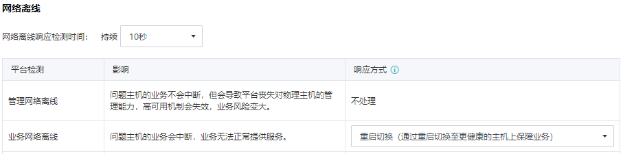 2. 业务交换机故障时,旁挂的AD探测不到主故障域上的MOM报表服务器业务,无法对外提供业务访问,外部用户访问业务中断。此时相当于超融合集群的物理出口连接的业务网口故障,因此承载MOM报表服务器的虚拟机需要HA,超融合平台的网络离线响应检测时间设置10s。