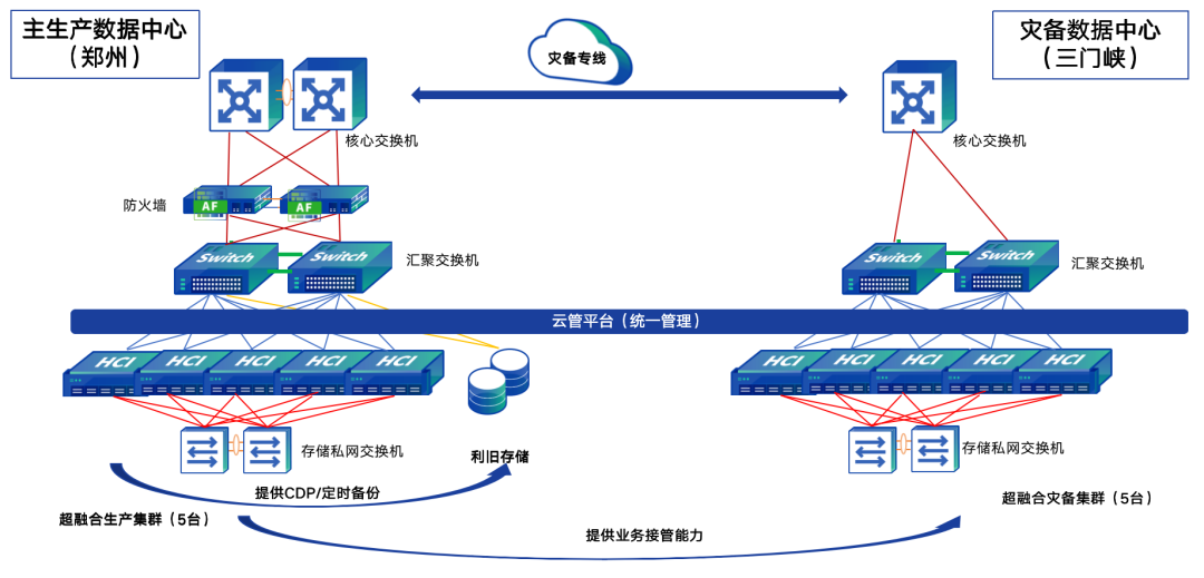 基于超融合平台内置的灾备能力,实现煤气集团本部主数据中心(郑州)与备数据中心(三门峡)重要业务系统异地应用级容灾。