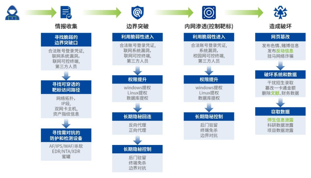 - 攻击的装备更齐全:利用0day漏洞、账号和钓鱼邮件等方式,突破高校的内部网络,进入内网后通过强对抗的木马、隐蔽隧道等完成后续操作。