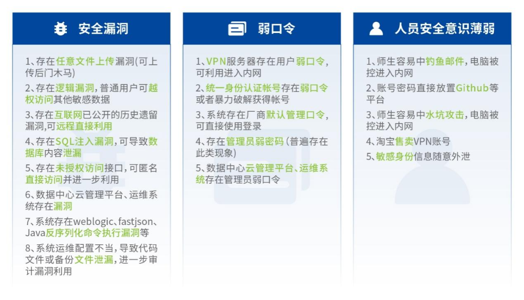 - 暴露面大,可突破入口多:随着教育数字化建设迈入深水区,高校有大量的业务系统暴露在互联网;高校人员结构复杂,有学生、教职员工、家属和第三方人员;现有的分校、分院、分支机构等都可能成为进入校园内网的突破口。