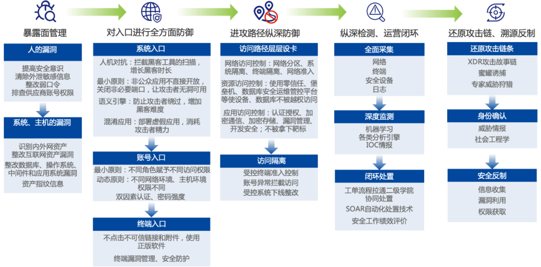 高校常被攻击的入口有很多,其中系统漏洞、账号、终端是最常见的三种入口,针对以上三个入口的防御思路如下: