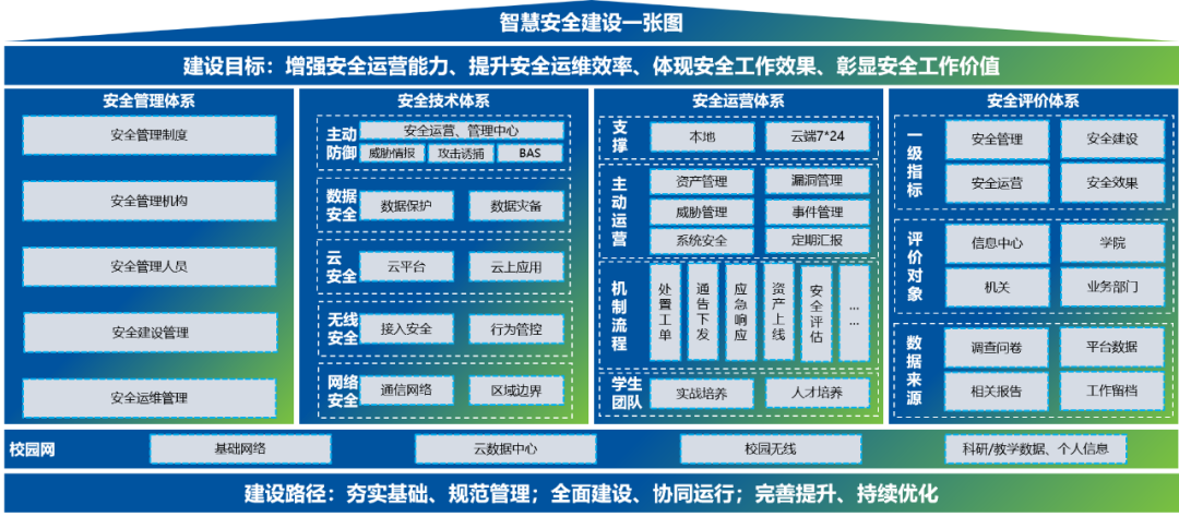 那么,什么是以安全绩效为核心的安全体系化建设呢?它本质上是由技术、组织、流程三方面构成的。深信服基于基于“人机共智”的理念,构建了智慧安全建设一张图,面向校园网基础网络、云数据中心、校园无线、科研/教学数据/个人信息等各类信息化设施,通过安全管理、安全技术、安全运营、安全评价四大体系实现校园网全面的安全支撑,最终实现“实战有效、体系合规、常态保护”的工作目标。