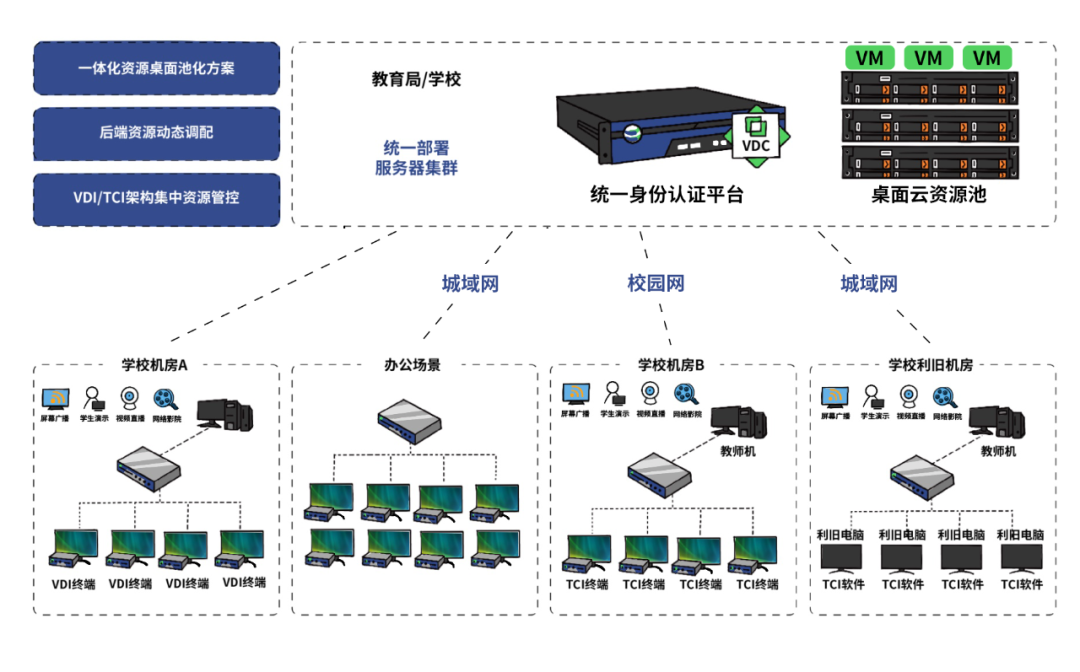 TCI架构的发布成为本次深信服普教桌面云全新升级的一大亮点,在原来VDI的基础上,全新的桌面云TCI架构适配更广阔的场景和细分用户需求。