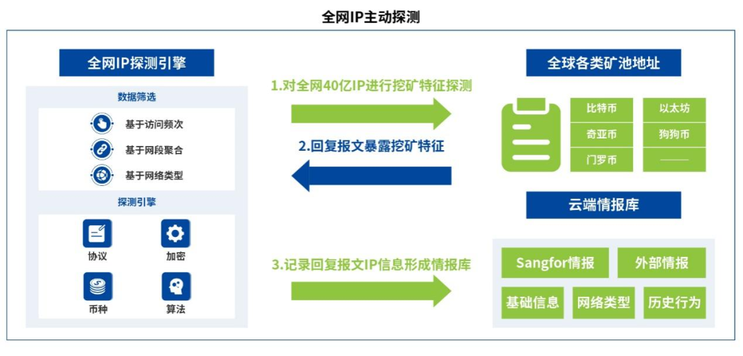 而在应对币种信息的不断迭代上,深信服首度将对全网40亿IP主动探测的威胁情报技术应用在实时监控全网IP中的新增矿池信息上。