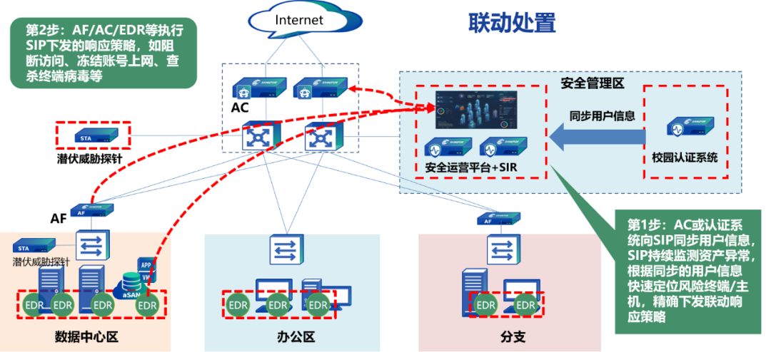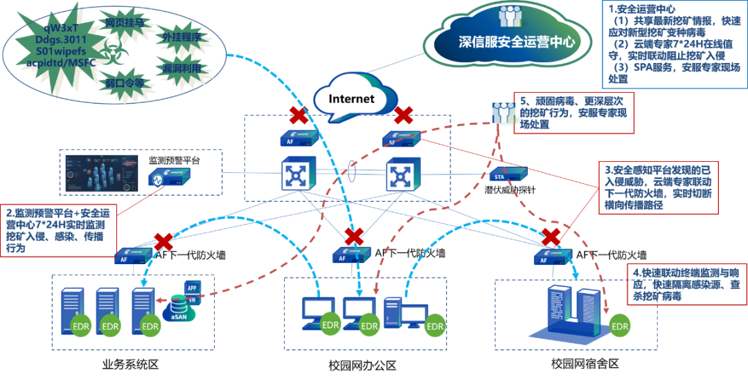 针对高校数据中心区终端:深信服通过安全感知管理平台SIP联动全网安全设备,基于边界流量、终端行为等多源维度捕捉“挖矿”行为;在发现后,通过自动化剧本,实现下一代防火墙AF流量阻断隔离、终端安全管理平台EDR关闭端口等自动化隔离,避免横向扩散;对于顽固病毒和深层“挖矿”行为,深信服还可派出安服专家进行现场处置闭环。