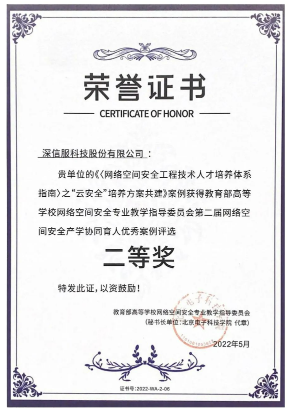 近日,由教育部高等学校网络空间安全专业教学指导委员会产学合作育人工作组主办、四川大学与华中科技大学共同承办的第二届网络空间安全产学协同育人优秀案例评选结果揭晓。深信服联合广州大学申报的《网络空间安全工程技术人才培养体系指南》之“云安全”培养方案共建荣获优秀案例二等奖。