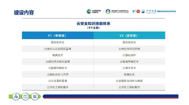 云安全知识体系属于多重交叉学科,深信服结合广州大学多学科交叉融合、前沿技术科研优势,引进产业界、学术界相关云安全专家级资源,共同研发主题式课程资源,构建“云安全”人才培养知识技能体系,按需求和差异的方式构建完善的云安全成长路径,为个人学习、教育界育人、产业界用人以及产教协同育人提供层次化、标签化支撑参考。