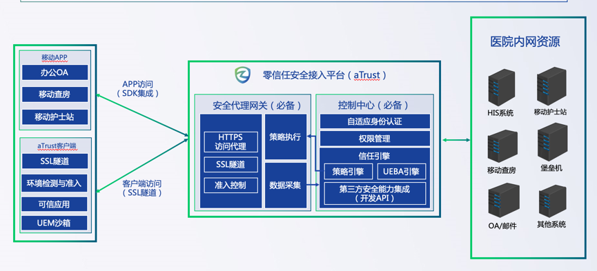 深信服利用零信任理念实现医院安全接入访问。为了兼顾安全性和用户体验,深信服根据不同的用户群体,采取特定的接入访问模式。针对医院职工办公安全接入仅提供客户端访问模式;针对运维人员提供客户端+UEM数据安全访问模式;针对移动APP安全接入(比如办公OA、移动查房、移动护士站等)可以集成aTrust SDK安全访问模式。