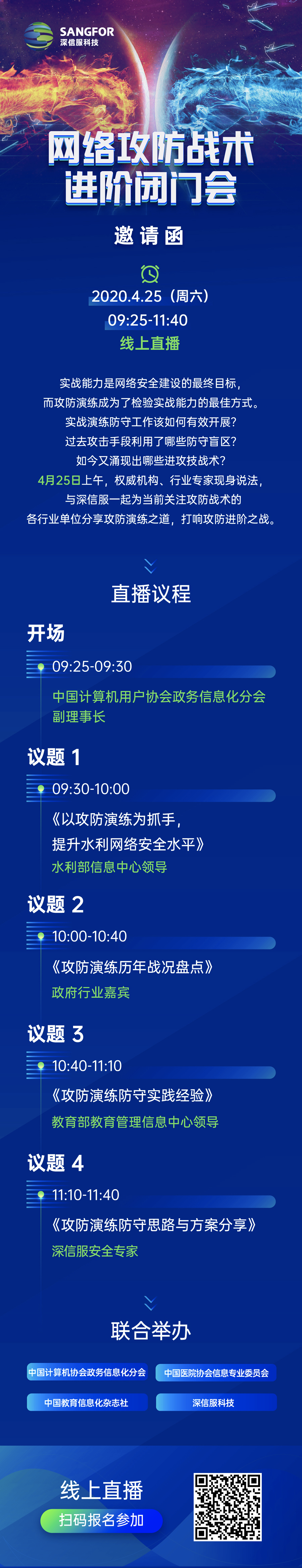 为了帮助各组织单位做好网络安全攻防演练准备工作,4月25日上午,深信服将与中国计算机协会政务信息化分会、中国医院协会信息专业委员会、中国教育信息化杂志社联合举办“网络攻防战术进阶闭门会”线上直播,扫描下方海报的二维码即可报名。