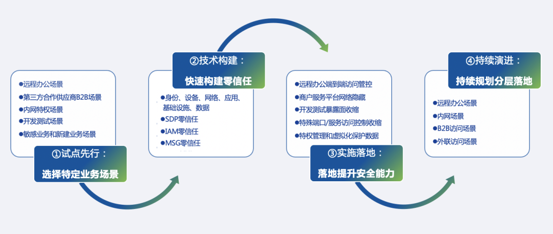试点先行选择特定业务场景,分步建设,利用零信任与现有边界、纵深防御架构结合和联动,缩小边界防御单元减少攻击暴露面,发挥高效安全控制能力,构建统一安全防护体系。