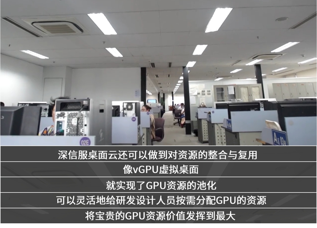 对于研发设计岗位而言,往往对于GPU资源的使用有着较高的要求,研祥通过桌面云实现了资源的整合、复用及共享,比如vGPU虚拟桌面就实现了GPU资源的池化,进行资源合理化分配,发挥出资源的最大价值,进一步提升了研发人员的办公体验。