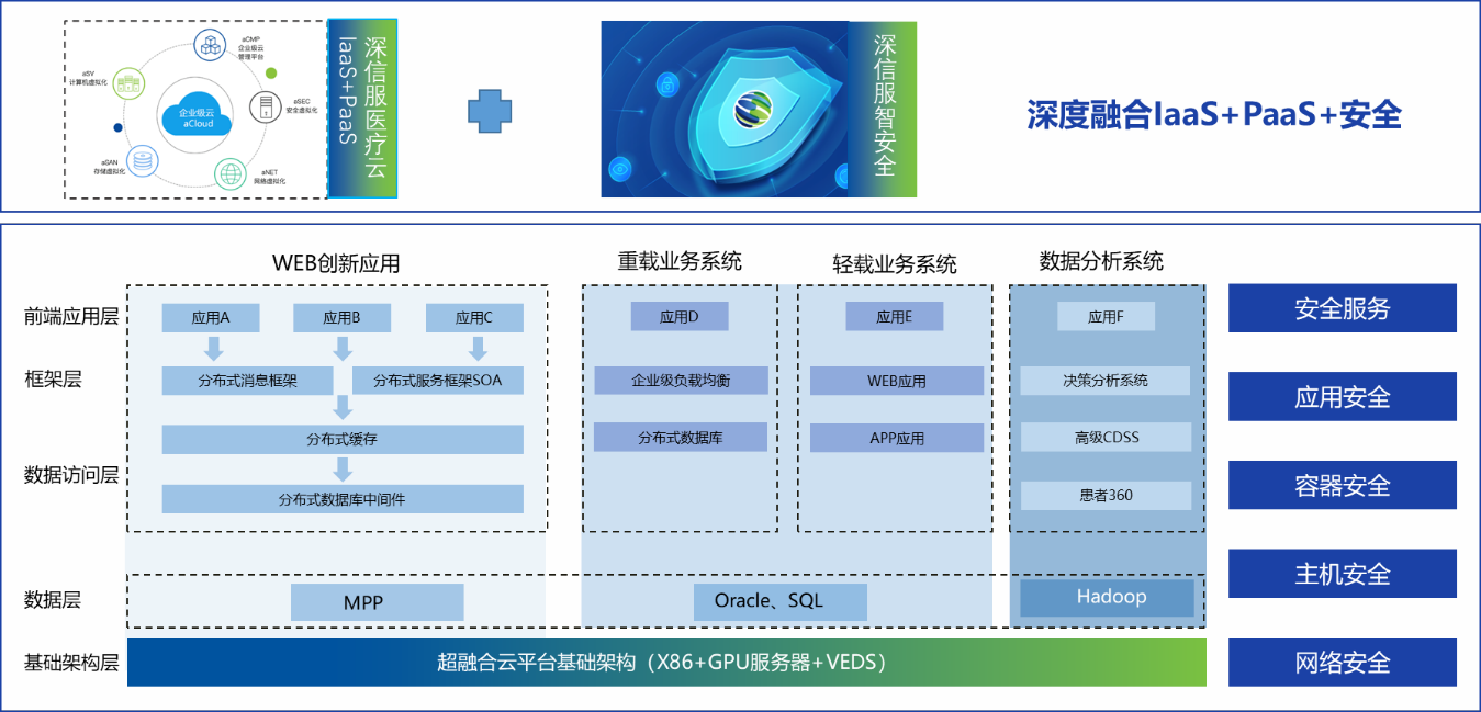 信服云以“1+1+N”建设理念,为医院构建1个私有云平台,包含计算、网络、存储、安全、运维、服务,满足高性能、弹性、安全可靠要求,一体化的端到端的安全防护,满足医院合规性、等保2.0建设需求,完全支撑智慧医院各类业务系统,满足数据库、大数据、人工智能、微服务等新技术需求。