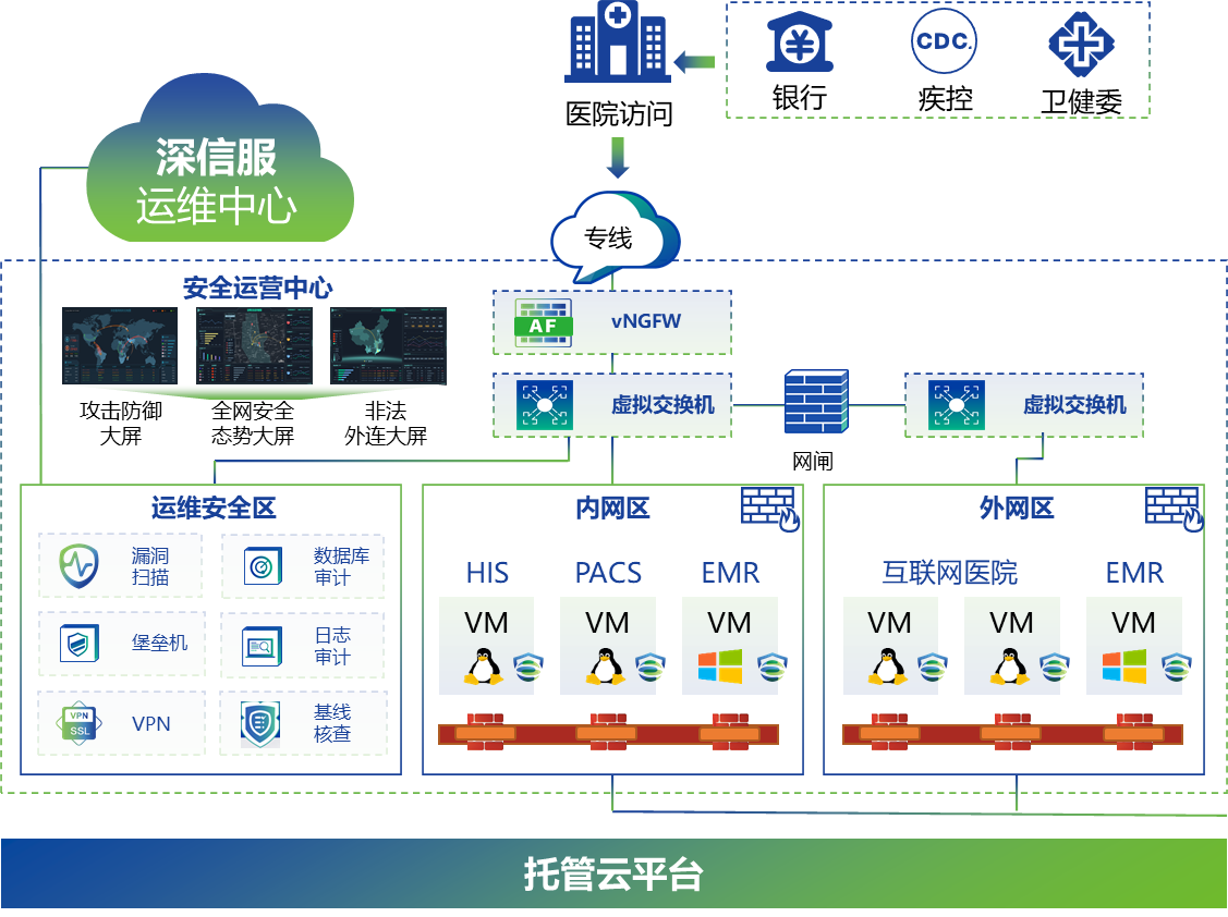 深信服提供全国本地化托管云节点,面向各类医院提供数据中心整体托管、互联网业务上云等多类型云化解决方案。