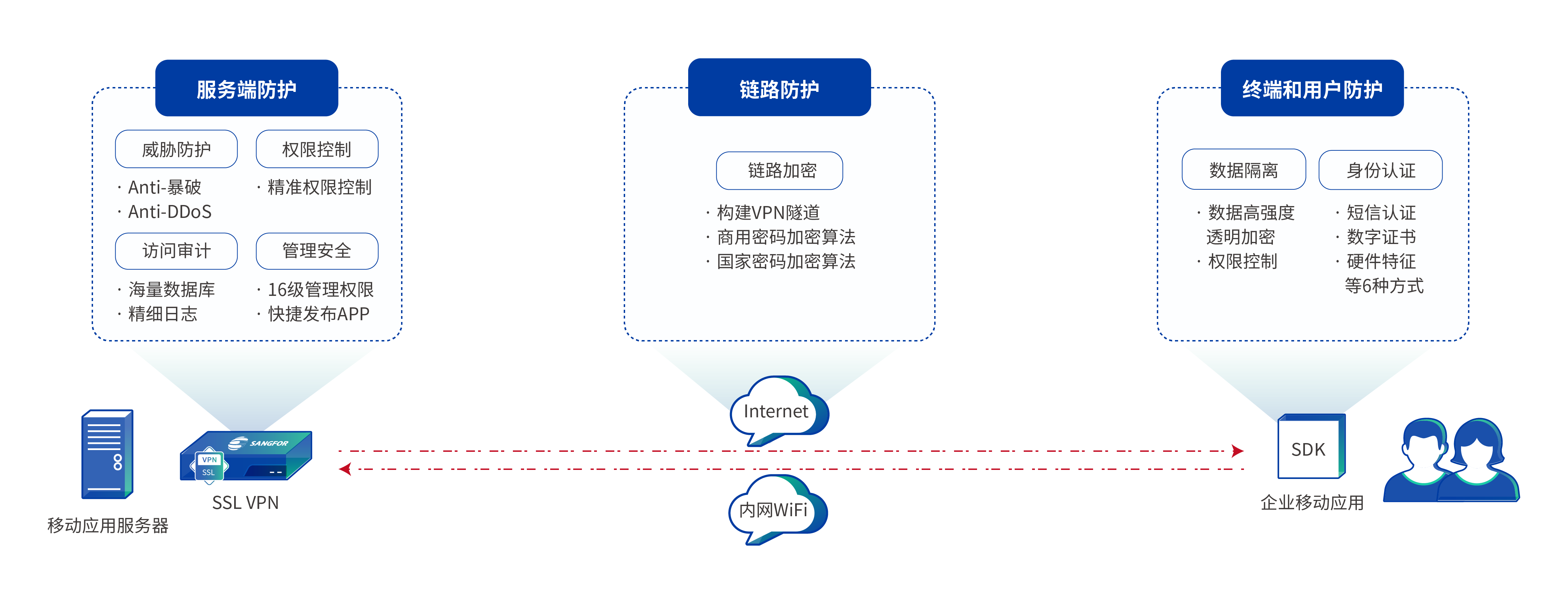 深信服EasyApp方案,提供了一种在企业移动应用程序中快速集成VPN客户端模块的方案。用户通过集成SDK,配置深信服 SSL VPN网关即可实现从用户、终端、链路、服务端的全面防护。