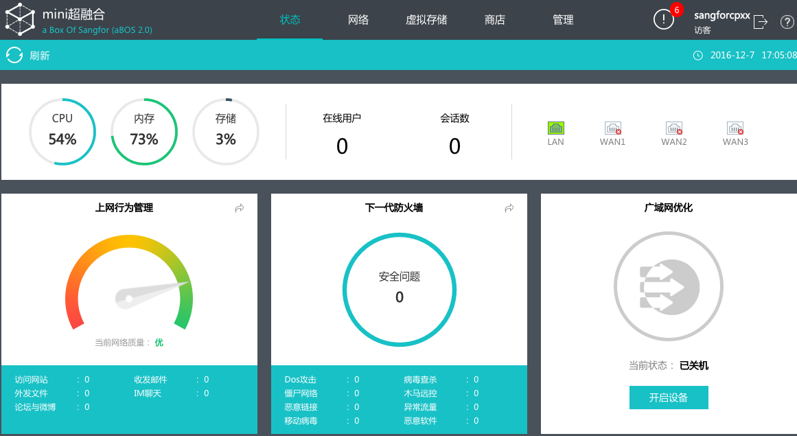 深信服aBOS分支一体机通过可视化的WEB管理平台可管理所有上网行为管理、IPSEC VPN、出口路由,实时监控各设备状况。BBC集中管理平台同时监测各分支网络流量及资源利用率,定位网络故障几分钟就可以解决,让运维管理更简单。