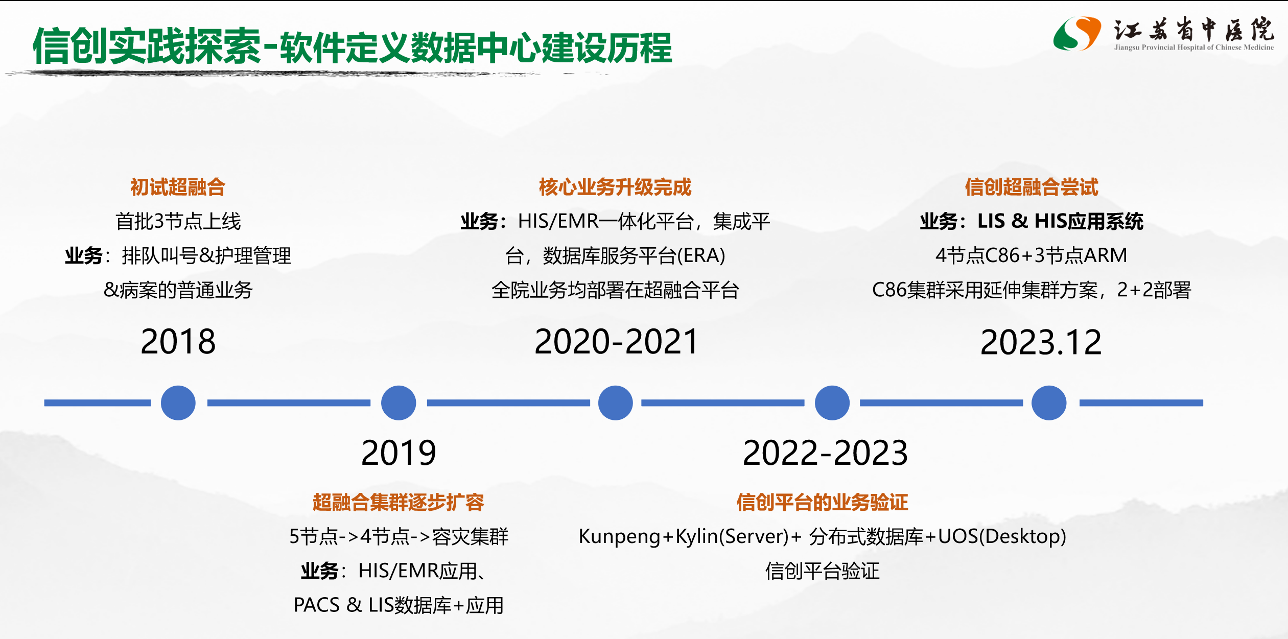 江苏省中医院门诊量是全国中医系统中唯一一个单体院区年门诊量过700万人次的医院,连续 23 年位居江苏省第一,综合服务能力持续保持在全国中医院的领先地位。一个大型综合性中医院在如此高体量业务并发下,不仅能长期保持业务系统的稳定运行,而且伴随着信创升级工作逐步深入行业,江苏省中医院秉持着“大胆假设,小心求证”的建设思路,制订翔实的信创推进计划,积极进行实践探索工作。