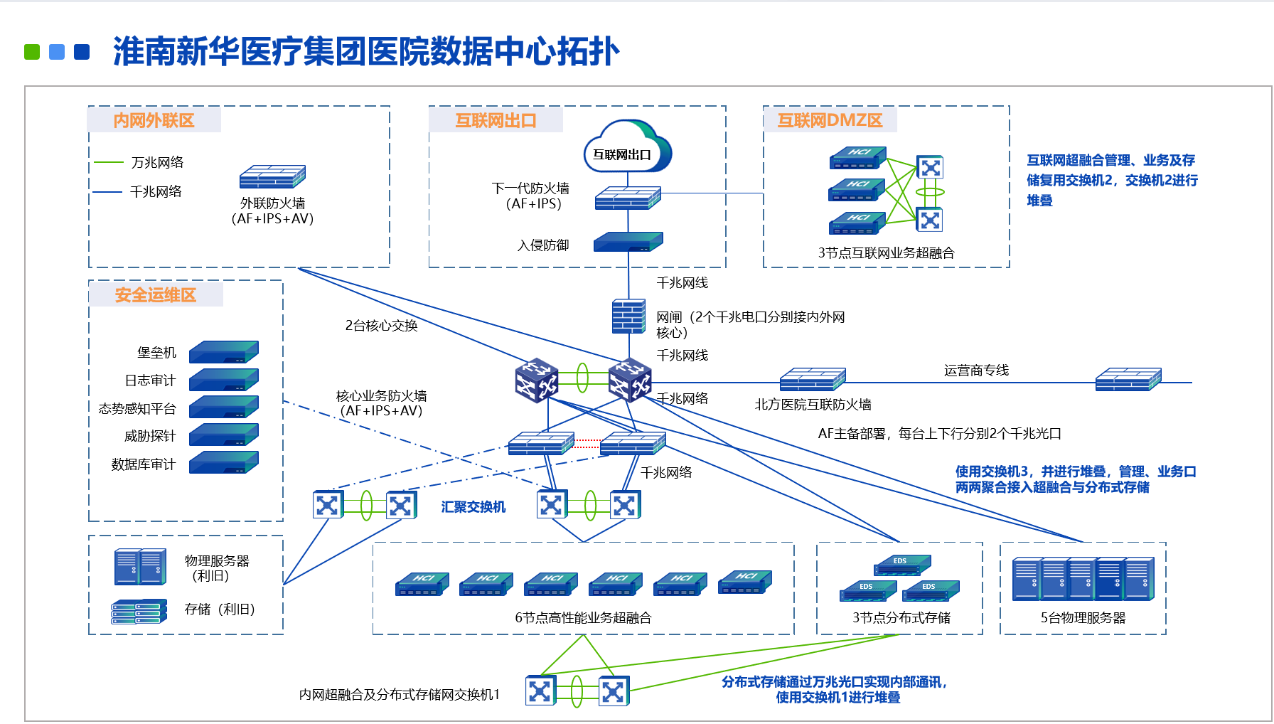 作为淮南市中西部地区唯一一所集医、教、研、防、康复、急救于一体的大型三甲综合医院,淮南新华医疗集团新华医院(安徽理工大学附属淮南新华医院)年门诊量约70万人次,服务周边人口200余万人。为充分贯彻落实《国务院办公厅关于推动公立医院高质量发展的意见》的政策引导,新华医院各级领导与信息中心高度重视信息化建设。医院数据中心趋向于集体化、规模化发展,亟需引入新的技术对当前数据中心进行改造升级,从而支撑医院日益增长的信息化建设需求。