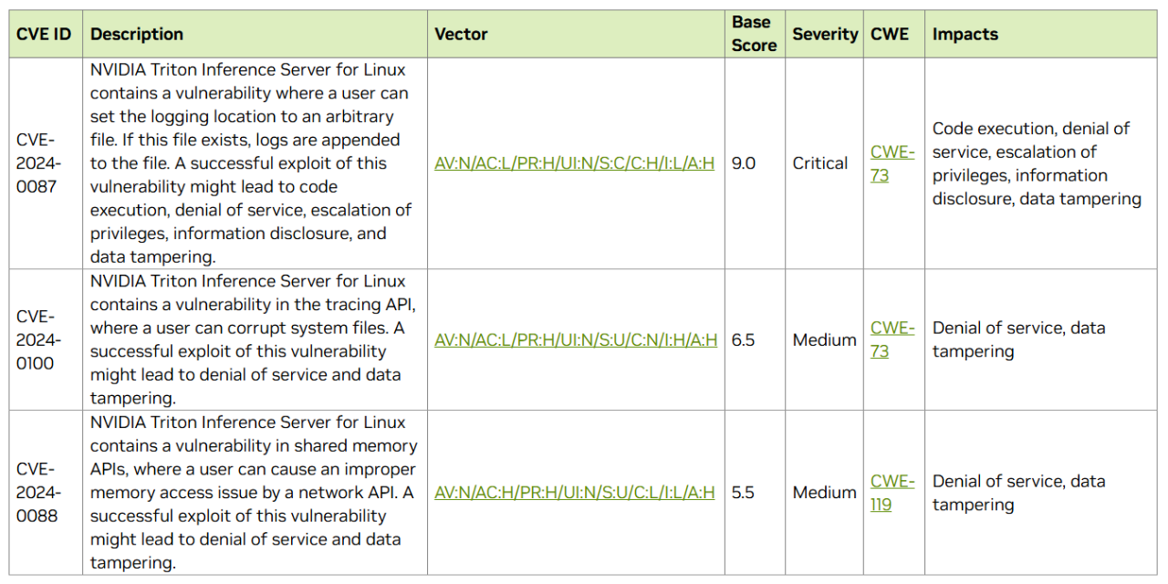 近日,NVIDIA(英伟达) 官方发布了一则安全风险预警和软件更新公告,公布 NVIDIA Triton 推理服务器存在着重要安全漏洞,提醒用户尽快进行版本更新。(涉及的漏洞为深信服发现并提报)