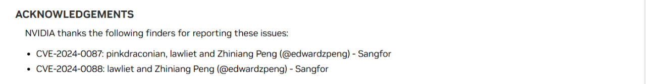 深信服安全研究员Lawliet和彭峙酿在日常研究过程中发现了这两个漏洞,随即编写详细的漏洞报告,积极与监管机构和NVIDIA官方取得联系。NVIDIA官方验证漏洞信息后第一时间发布官方公告提醒用户更新,并致谢深信服。