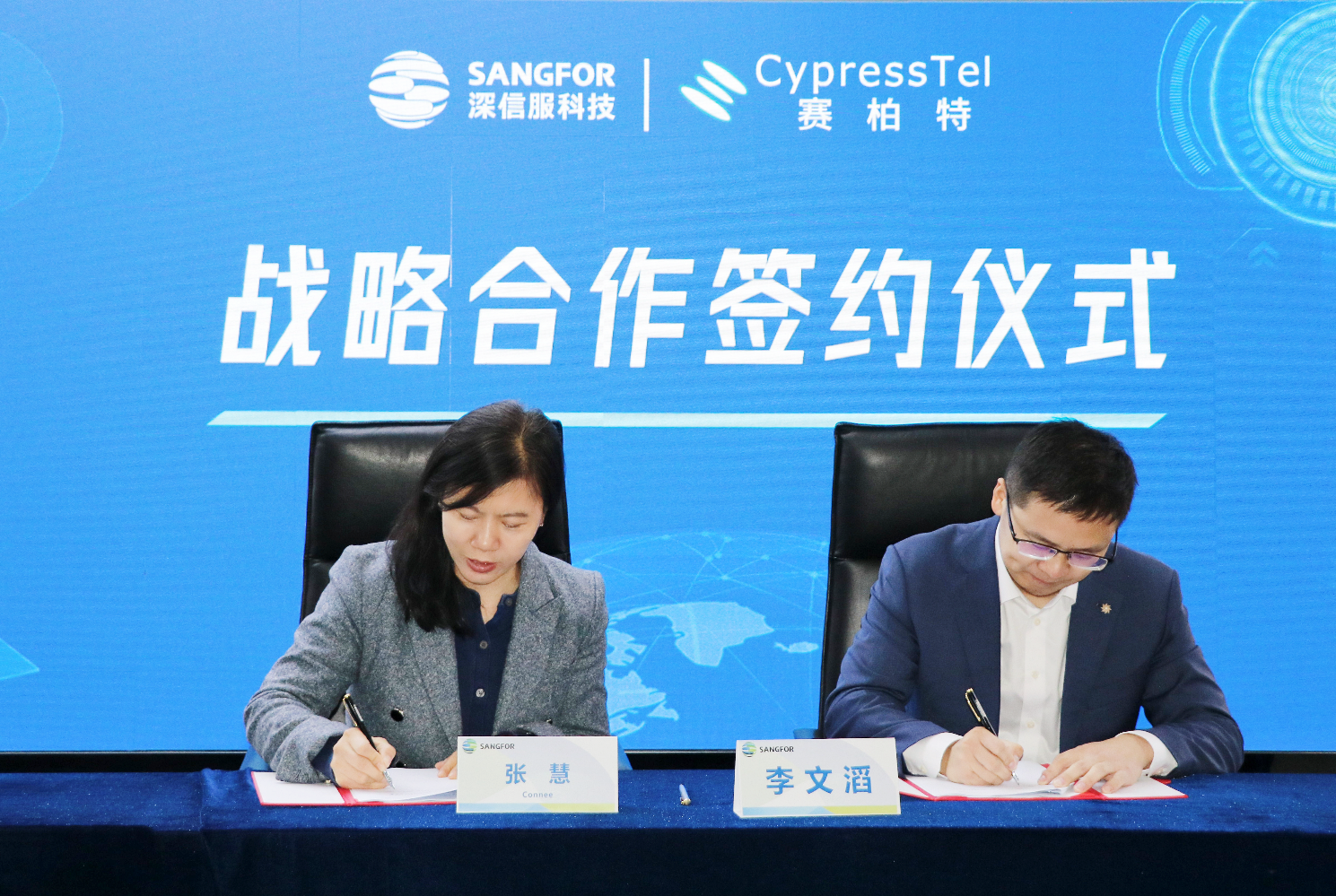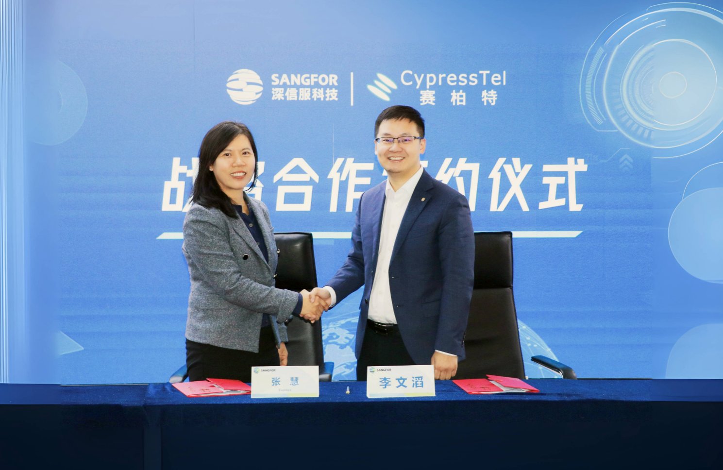 2月1日,深圳市赛柏特通信技术有限公司(以下简称“CypressTel赛柏特”)与深信服科技股份有限公司(以下简称“深信服”)签署战略合作协议,正式达成全国战略合作伙伴关系。CypressTel赛柏特CEO张慧、深信服副总裁兼安全业务总经理李文滔出席仪式并代表双方签约,就深化全方位战略合作事宜进行座谈交流。