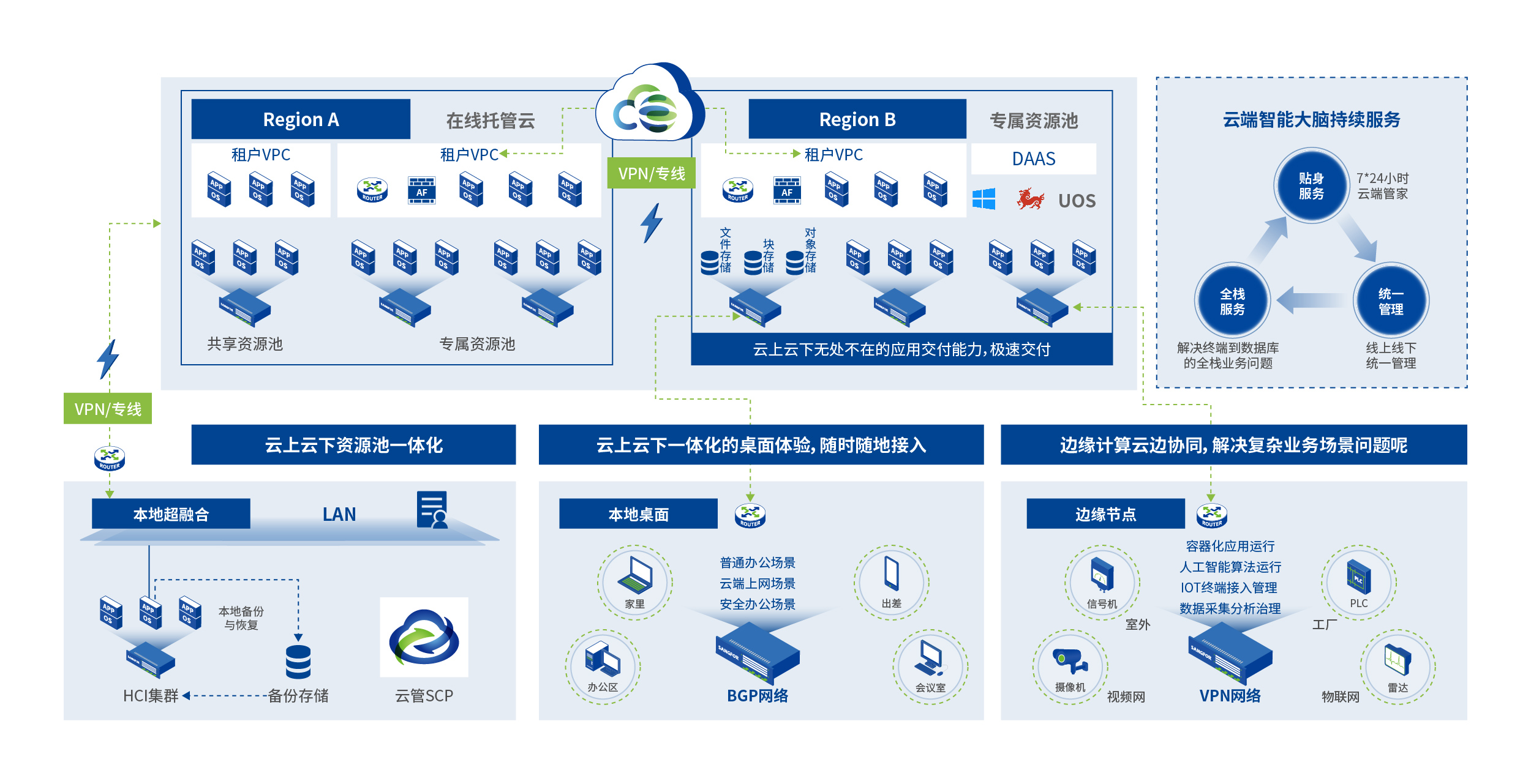 同时建设云端服务中心,为线下私有云用户提供云上的灾备服务、数据库服务、安全防护服务等等,把复杂的IT运维交给云端专家,把简单高效留给客户。